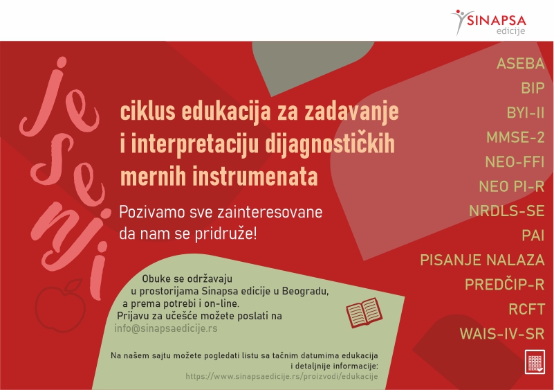 Pored svetski poznatih klasika (NEO PI-R, WAIS-IV-SR, PAI, MMSE-2, NRDLS, PREDČIP, RCFT), ove jeseni predstavljamo i dve nove edukacije za standardizovane instrumente u našoj ponudi – BYI-II i ASEBA. Ova dva nova instrumenta namenjena su psiholozima, ali i stručnjacima srodnih profesija (psihijatrima, pedagozima, logopedima, lekarima, defektolozima i svima koji rade sa decom i adolescentima).
